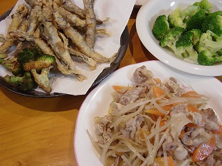 ししゃものフライ・もやしと豚肉の炒め物・ブロッコリーサラダ