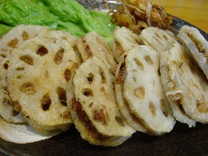 1.れんこんは皮をむき、5mm厚さに切り、酢水にさらす。