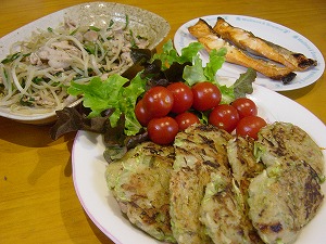 ミニお好み焼き・焼き鮭・もやしの中華炒め