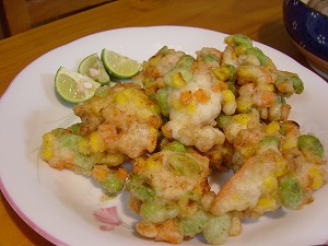 枝豆・冷凍コーンに合わせて、にんじん・玉ねぎ・ささみを小さく切り、小さい物ばかり集めて掻き揚げ風にしました。