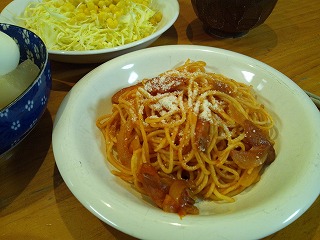- スパゲッティをお好みに茹でます。玉ねぎは千切り、ピーマンは輪切り、ウインナーは斜め切りにします。