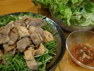 豚ロース肉をしょうゆ・砂糖などの甘いダレで焼いて、サニーレタスで食べます。