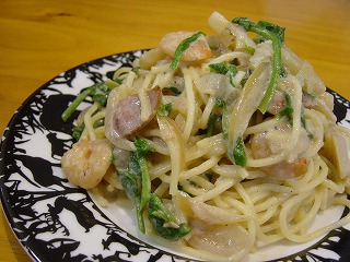 - にんにくの香りがたったら2.にスパゲッティの茹で汁を加えて、塩コショウで味を整え、ほうれん草も入れる。パスタを加えてからめたら出来上がり。