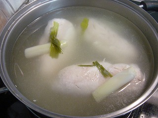 - 1.のとり肉を取り出し、1枚ずつくるくると巻き、サランラップで巻きつける。鍋に1.の香味野菜と一緒に入れ、水1リットルを加えて強火にかける。