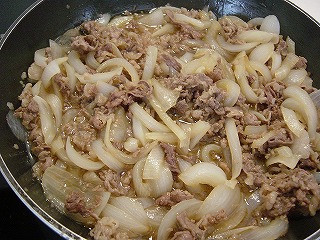 ②①の玉ねぎがしんなりしてきたら、ケチャップ・ソース・マスタード・みりん・水を入れて煮込みます。