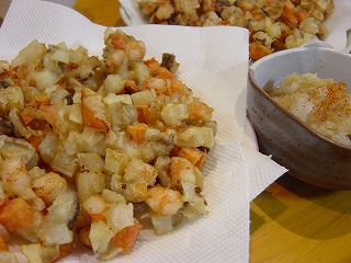 - 具は玉ねぎ・じゃがいも・えび・ホタテ・しいたけ。全て1cm角くらいの大きさに切ります。