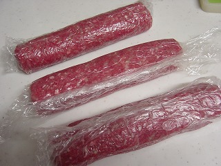にんじんは1cm角の拍子木切りにし、オーブンレンジの茹で機能で茹でる。ゆで卵はくし形に6つに切る。 - ラップを約30cm長さに広げ、たねを厚さ約1cmの長方形に広げる。長いほうの辺を手前にし、真ん中ににんじん、卵を並べてくるりと巻いて形を整え、巻き終わりをしっかり閉じる。