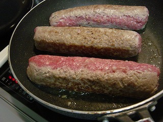 フライパンにバター大さじ2を溶かし、2.のラップをはずして入れ、前面を焼き付ける。煮ている間に肉汁が外に出ないように表面をしっかり焼き固める。
