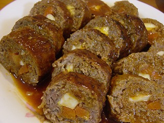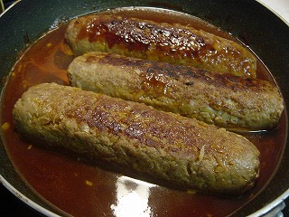 あいている所にBのソースの材料のうち、ケチャップとソースのみを入れる(酸味を飛ばすとまろやかになります)。残りのBのソースを入れ蓋をし、時々ミートローフを転がしながら15~20分煮る。食べやすく切ってソースとともに器に盛りつければ完成。