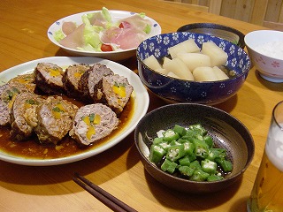 本当はハンバーグにしようと思ったのですがひき肉が足らなかったので野菜を包みミートローフにしました。
