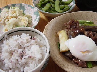 今日の雑穀ご飯のおかずは、コンニャクと牛肉とねぎの甘辛い炒め半熟卵のせ・ポテトサラダ・枝豆・お味噌汁。