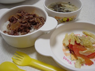 牛丼・・・牛肉を炒め、玉ねぎを入れ、醤油・砂糖・お酒・塩で最後まで作る。