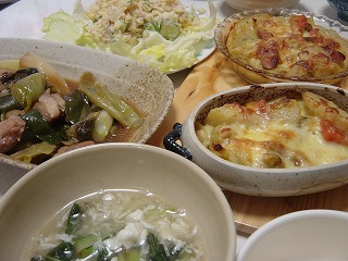 【グラタン】をオーブントースターに入れ焼きはじめ、【ねぎと鶏肉】をにんにく・醤油・砂糖・みりん・ダシで炒め、【塩コショウで小松菜を炒め卵白あん】をかけ、【マッシュしたポテト】にシーチキンとマヨネーズ・砂糖・塩・からしをあわせ混ぜ、出来上がり。