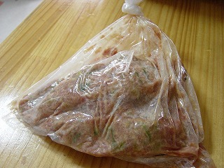 朝からとりつくねを作る。袋につくねのたねを入れ袋の入り口を縛り、よく揉む。手も食器類も汚れないのでとっても楽。