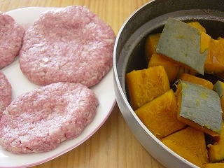 煮込みハンバーグはタネ作り、かぼちゃの煮物は最後まで作っておきました。