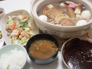 メニューはおでん。後は野菜炒めと具沢山お味噌汁。後は冷やっこなど。