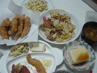 【晩ご飯のメニュー】鶏ささみのフライ・残り物野菜の自家製タレ炒め・マカロニサラダ・冷やっこ・具沢山お味噌汁などなど。