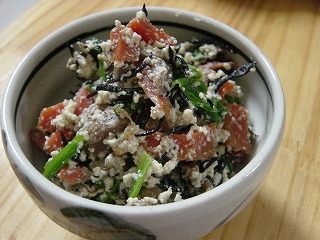 ひじき・ほうれん草・豆腐・にんじん・豚肉・しいたけ・ゴマ、鉄分たっぷりの一品です。