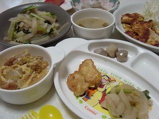 メニューは鶏のカピタ・里芋の煮っ転がし・大根と小松菜のゴマ油炒め・カツ丼(冷凍しておいた残りのヒレカツ)・大根の麦味噌汁etc..
