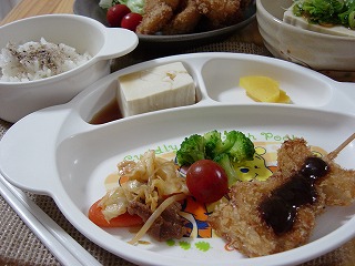 メインメニューは串カツ。豚肉と玉ねぎを串にさし、衣をつける前まで済ませ、付け合せのブロッコリーも茹でておきました。