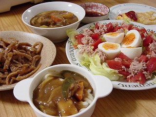 私の得意なつながり料理、昨日のカレーの残りをカレーうどんに変身させました。ねぎと醤油やみりん、酒などを加えるだけだからとっても簡単。(レシピはこちら)