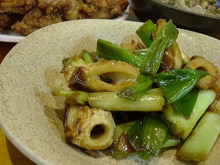 こちらも同様、ごま油で炒めた、ちくわとねぎの炒め物。